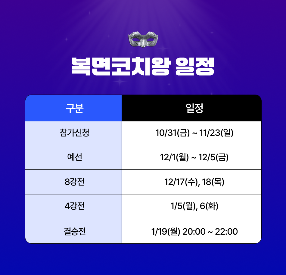 복면코치왕 행사 신청 후 종료까지 다수의 안내가 있을 예정입니다. 반드시 이메일과 카카오톡 메시지를 확인해 주시기 바랍니다.