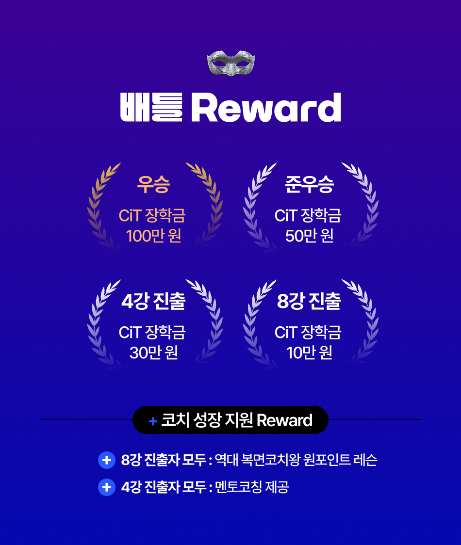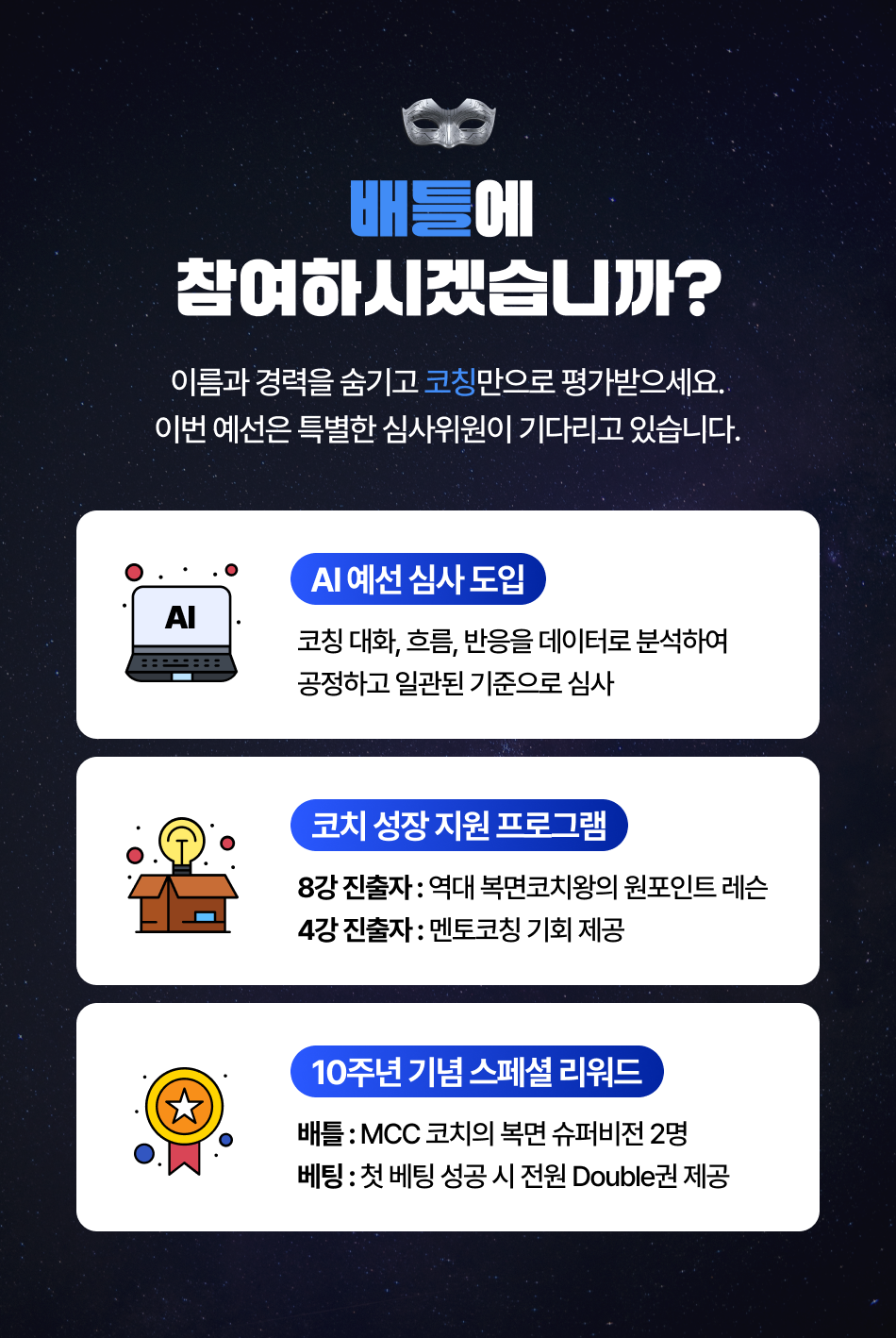 2016년부터 시작된 CiT 시그니처 이벤트! 이름, 경력, 자격증 떼고 오로지 코칭 실력으로만 승부하는 국내 유일 블라인드 코칭 오디션, 복면코치왕