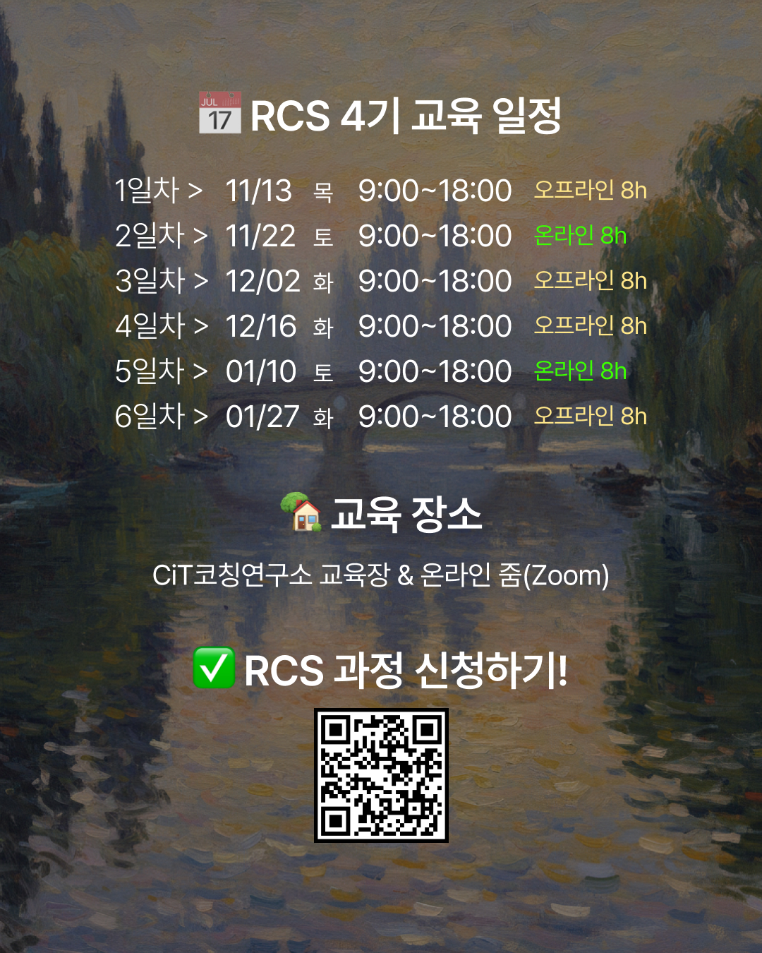 수료 기준: 코칭 슈퍼비전 실습 15시간(그룹 코칭 슈퍼비전 5시간 이상 포함) 진행 후 실습 로그 제출 시 수료
