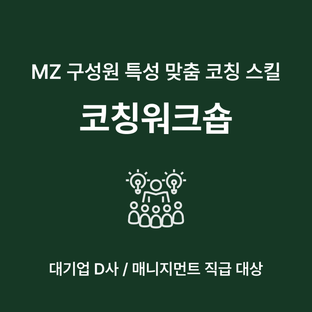워크숍 프로그램 코칭워크숍: 대기업 D사 매니지먼트 직급 대상, MZ세대 구성원 특성에 맞춘 코칭 스킬, 현장 소통 역량
