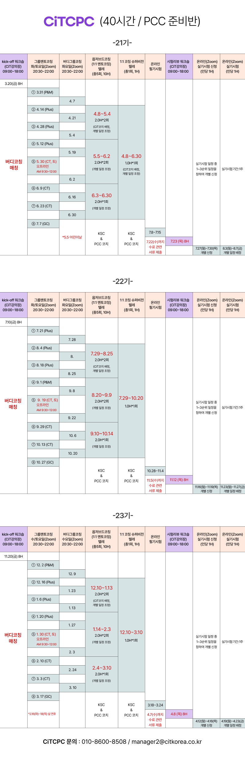 킥오프 워크숍, 리뷰 워크숍은 반드시 참석해야 하며, 이 외 PCC 준비반 출석 및 수료 규정을 준수해 주시기 바랍니다.